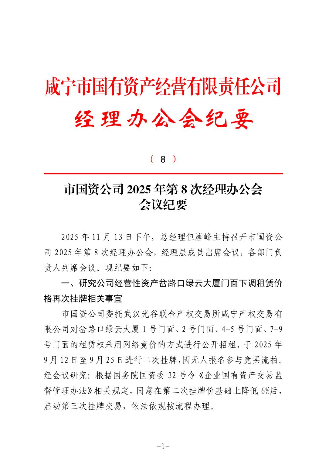 名       称: 市国资公司2025年第8次经理办公会会议纪要 发布日期: 2025年11月24日