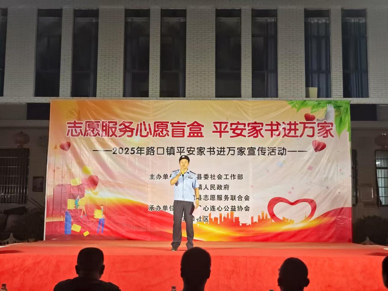 为深入推进平安乡村建设,助力乡村振兴战略实施,路口社区驻村工作队积极协同配合社区与崇阳县心连心公益协会,于2025年9月11日在路口社区党群服务中心小广场举办“志愿服务心愿盲盒·平安家书进万家”宣传活动。本次活动由崇阳县委社会工作部、路口镇人民政府主办,通过群寓教于乐的形式将安全知识送入千家万户,切实提升村民安全意识与社区凝聚力。