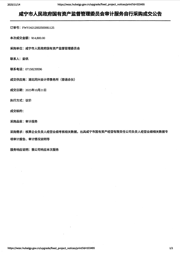 名       称: 咸宁市人民政府国有资产监督管理委员会审计服务自行采购成交公告 发布日期: 2025年11月14日
