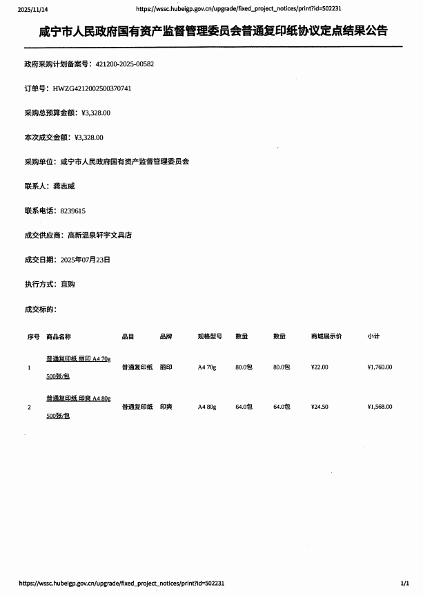 名       称: 咸宁市人民政府国有资产监督管理委员会普通复印纸协议定点结果公告 发布日期: 2025年11月14日