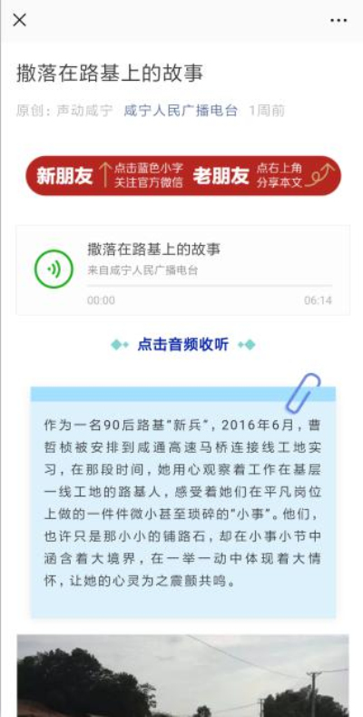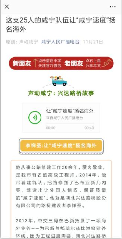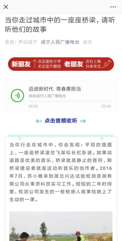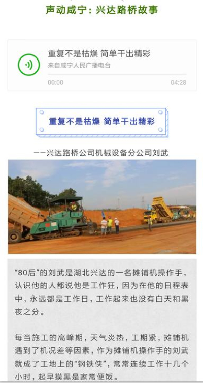 为进一步营造爱国奋斗、建功立业的社会风尚,交投集团创新宣传方式,将集团组建以来涌现出的一批忠于职守、爱岗敬业、无私奉献的富有交投特色的爱国奋斗小故事制作成音频作品通过咸宁广播电台“声动咸宁”栏目播出,充分发挥交投集团先进人物的典型引领作用,凝聚员工爱国意志、振奋员工工匠精神。通过“空中传播”让更多的市民了解交投、认识交投,进一步树立了交投集团的铁军形象。